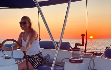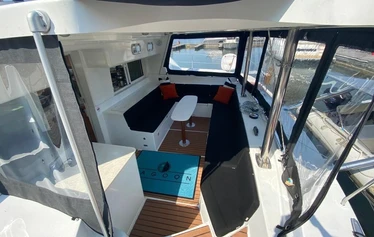 The catamaran is very stable, so you don't have to worry about seasaw or seasickness. The deck is covered, so you can eat outdoors even if it rains. Every participant can take part in operating the boat if they want. You will be instructed and helped by your experienced skipper.
